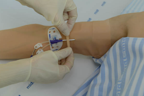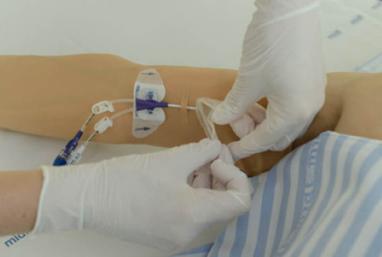 Er katetret gledet ind i armen, trækkes det forsigtigt ud til det antal cm, det var på anlæggelsestidspunktet.
